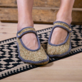Dank der Schuhbändchen, die mit einem Knopf verschlossen werden, bleiben die Slipper gut am Fuß sitzen.