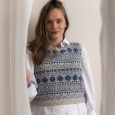 Dieser Slipover mit weiter Passform wird von unten nach oben mit Schnittmaschen gestrickt. Er hält an kühlen Sommerabenden und früh morgens wunderbar warm.  Die Bündchen werden mit verschränkten Maschen gestrickt und der Körper hat ein farbenfrohes Muster. Die Designerin hat die Farben gewählt, die sie an den Himmel und die verschiedenen Blautöne des Meeres erinnert.