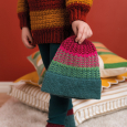 Eine Kindermütze mit glatt rechts gestrickter Krempe, die in der Mitte nach innen umgeschlagen und zusammengestrickt wird. Der Rest der Mütze wird im Rippenmuster mit bunten Farbübergängen gestrickt.