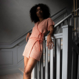 Eine Wickelbluse mit einem einfachen, aber sehr schönen Strukturmuster, welches aus rechten, linken und abgehobenen Maschen besteht. Der mehrfarbige Effekt entsteht durch normale Streifen. Die Bluse wird in Hin- und Rückreihen von oben nach unten gestrickt, mit Raglanzunahmen und Zunahmen vorne in der Mitte. Ungefähr ab der Taille wird die Bluse gerade gestrickt. Entlang des Vorderteils, dem Ausschnitt und bei den seitlichen Nähten werden I-Cords gestrickt, die über die Teile hinaus weitergestrickt werden, um mit diesen die Wickelbluse zuknoten zu können. Die Ärmel werden in Runden gestrickt und mit einem etwas strafferen I-Cord abgekettet, um kleine Puffärmel zu gestalten.