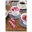 Ein dicht gehäkelter, stabiler Untersetzer mit glatter Oberfläche, der Gläser und Tassen sicher stehen lässt. Der Untersetzer wird in festen Maschen gehäkelt, die Zunahmen werden so verteilt, dass sie nicht auffallen und den Abschluss bildet eine dekorative Kante aus zusammengehäkelten Stäbchen. In reinem Leinen gearbeitet, verströmen sie einen Hauch von Luxus, aber natürlich kann man sie auch im preiswerten Baumwollgarn Järbo 8/4 häkeln.