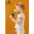 Das Shirt wird bis zu den Armausschnitten rund gestrickt und dann geteilt. Die Halsausschnittblende hat verkürzte Reihen und die Schulternähte strickt man zusammen. Die Ärmel werden von oben nach unten gestrickt. Alle Bündchen haben eine doppelte Blende, an den Ärmeln in Kontrastfarbe. Zum T-Shirt gibt es auch passende Shorts. Am Shirt selbst gibt es praktisch keine Nähte.