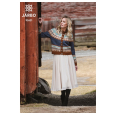 Maja ist eine kurze, moderne Strickjacke mit einer gemusterten Schulterpartie wie bei den traditionellen, isländischen Pullovern. Ebenso wie bei vielen Islandpullovern wird ein Teil des Musters von der Schulterpasse unten an den Ärmeln wiederholt, aber in diesem Modell ist das Muster extra lang. Der Rumpf und die Ärmel werden einzeln gestrickt in Runden gestrickt und anschließend auf einer langen Rundstricknadel zusammengefügt, um die Schulterpasse mit dem Muster und den Abnahmen zu stricken. Der Halsausschnitt endet mit einigen verkürzten Reihen, um das Rückenteil ein wenig anzuheben. Die Strickjacke wird aufgeschnitten und es werden Maschen für die Blenden vorne aufgenommen.