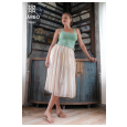 Das sommerliche Top wird in einem Stück von oben nach unten gestrickt. Eine lange Blätterranke erstreckt sich diagonal von der rechten Schulter über das Vorder- und Rückenteil. Das Blattmuster entsteht durch rechte und linke Maschen und sieht auch von der Innenseite so schön aus, dass man das Top auch links herum tragen kann, wenn man abwechseln will. Das Rückenteil ist oben etwas höher und breiter als das Vorderteil, um einen BH-Verschluss zu verbergen. Für die Gestaltung der Taille des Tops gibt es vier Varianten.